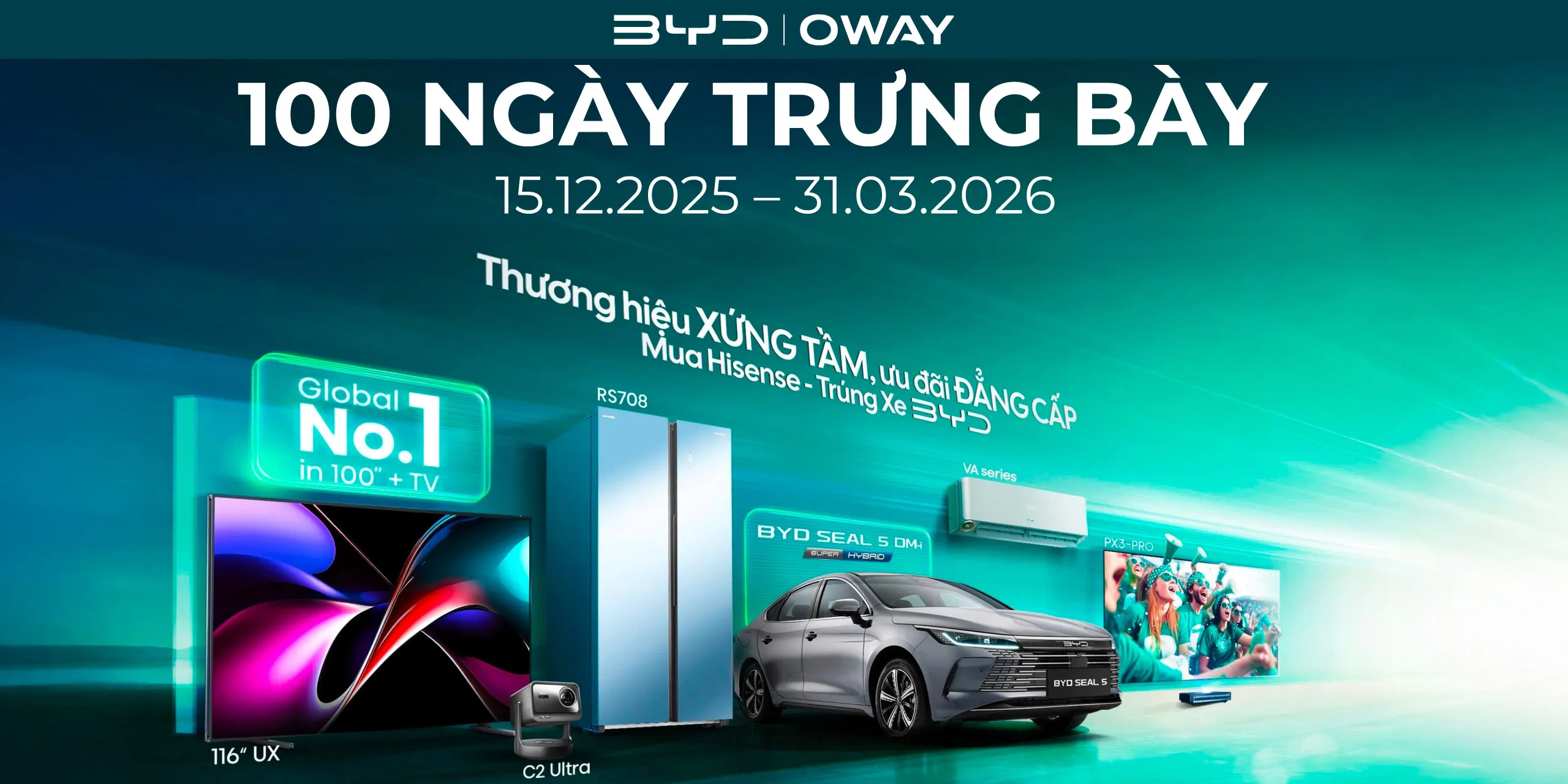 Từ 15/12/2025 – 31/03/2026, BYD OWAY Sài Gòn phối hợp cùng Hisense triển khai chuỗi hoạt động trưng bày và trải nghiệm xe năng lượng mới tại hệ thống showroom Hisense trên toàn quốc.